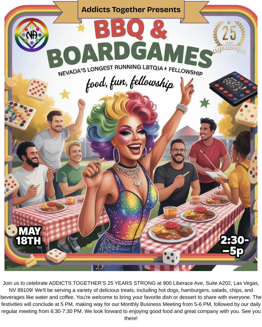 Addicts Together is having its 25th Anniversary with some food, fun and fellowship! Board games, BBQing and all the fixings.