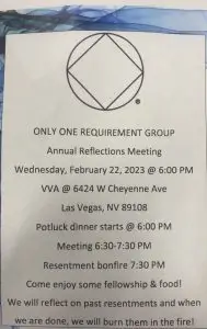 Potluck dinner, meeting and resentment bonfire; Come enjoy fellowship & food!