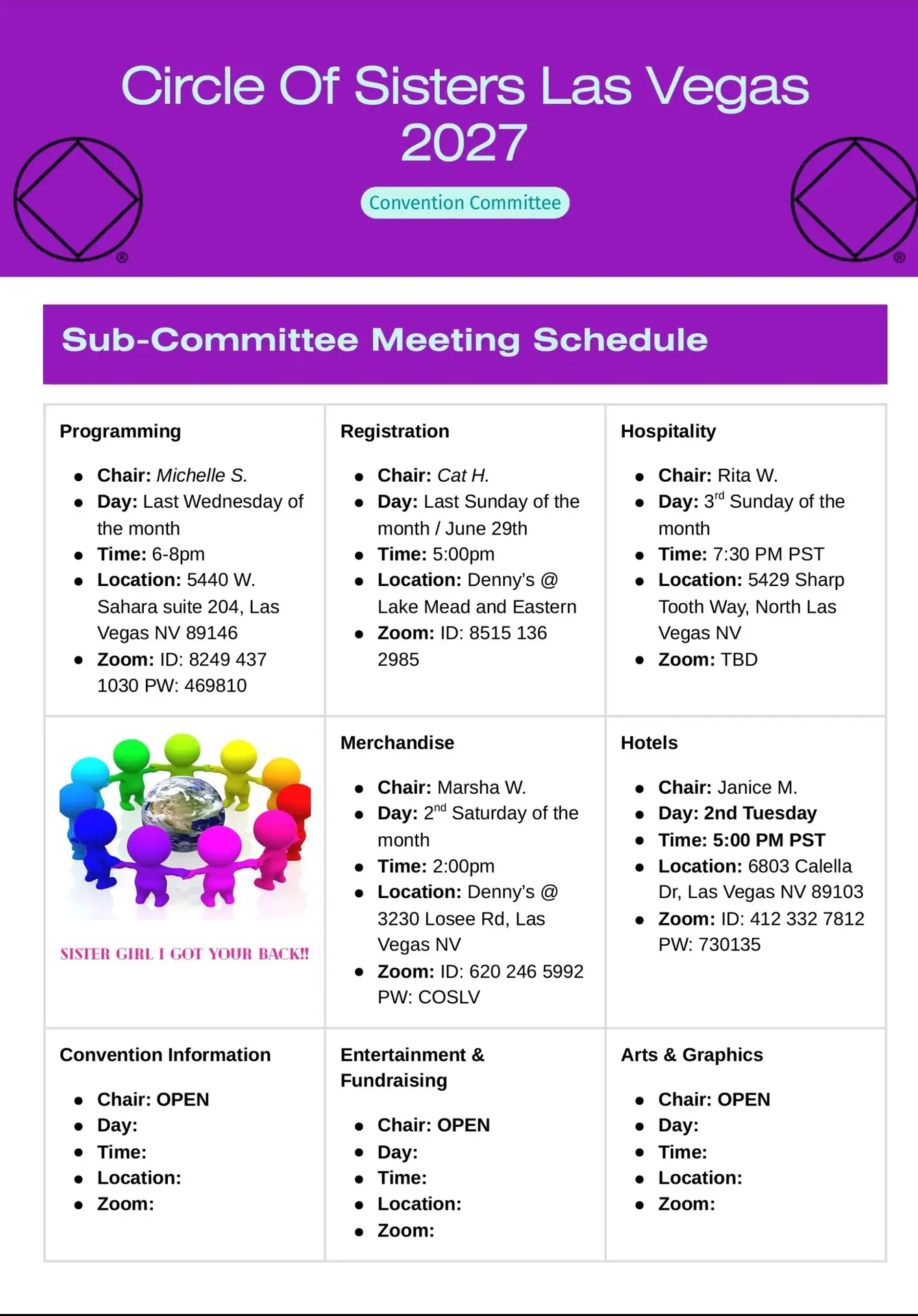Circle of Sisters sub committee meetings – Merchandise – Hotels – Programming – Registration – Hospitality OPEN POSITIONS