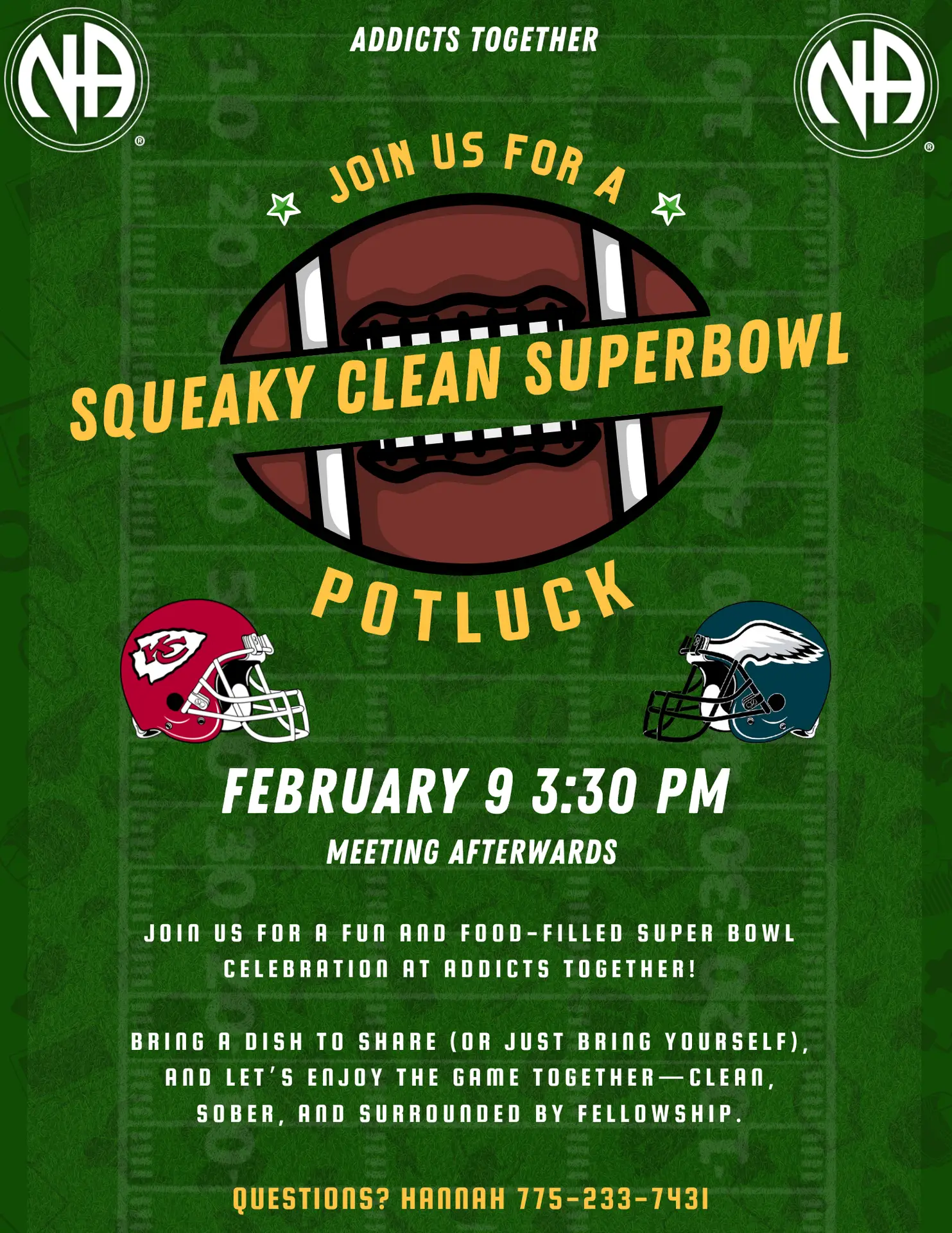 Join us for a Super Bowl Watch Party at Addicts Together! Whether it’s for the game, the commercials, the halftime show or the fellowship – come join us for a good ol clean time!