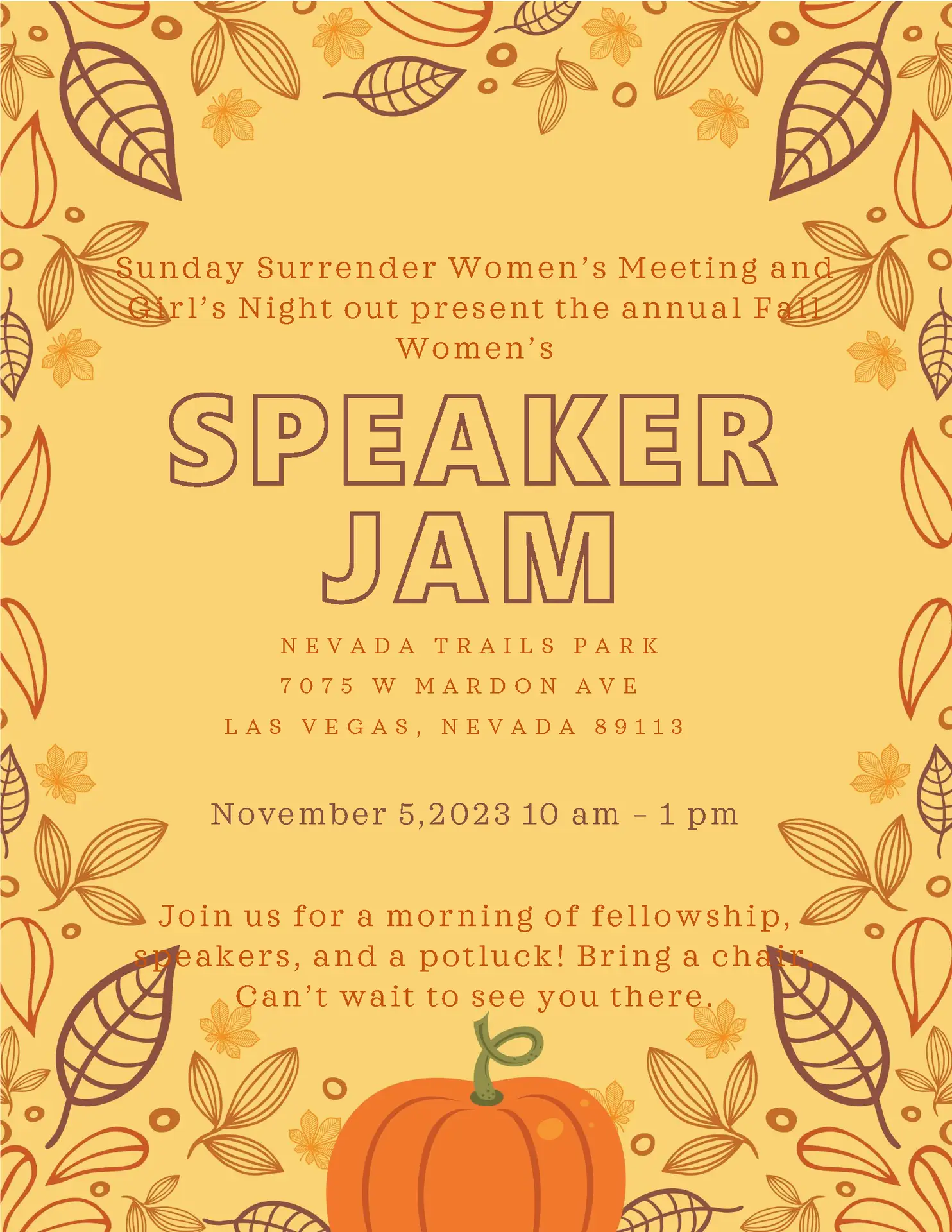 Sunday Surrender Women’s Meeting and Girl’s Night out present the annual Fall Women’s Speaker Jam