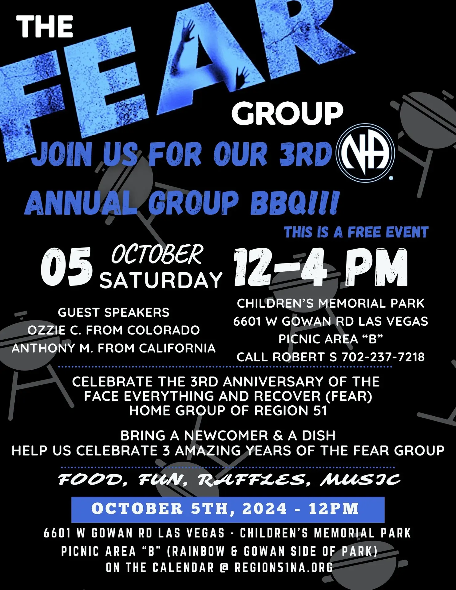 Join the FEAR (Face Everything And Recover) home group of NA for their 3rd annual BBQ held at Children’s Memorial Park located at 6601 W Gowan Road on Saturday October 5th from 12-4 PM for Food, Fun and Raffles!