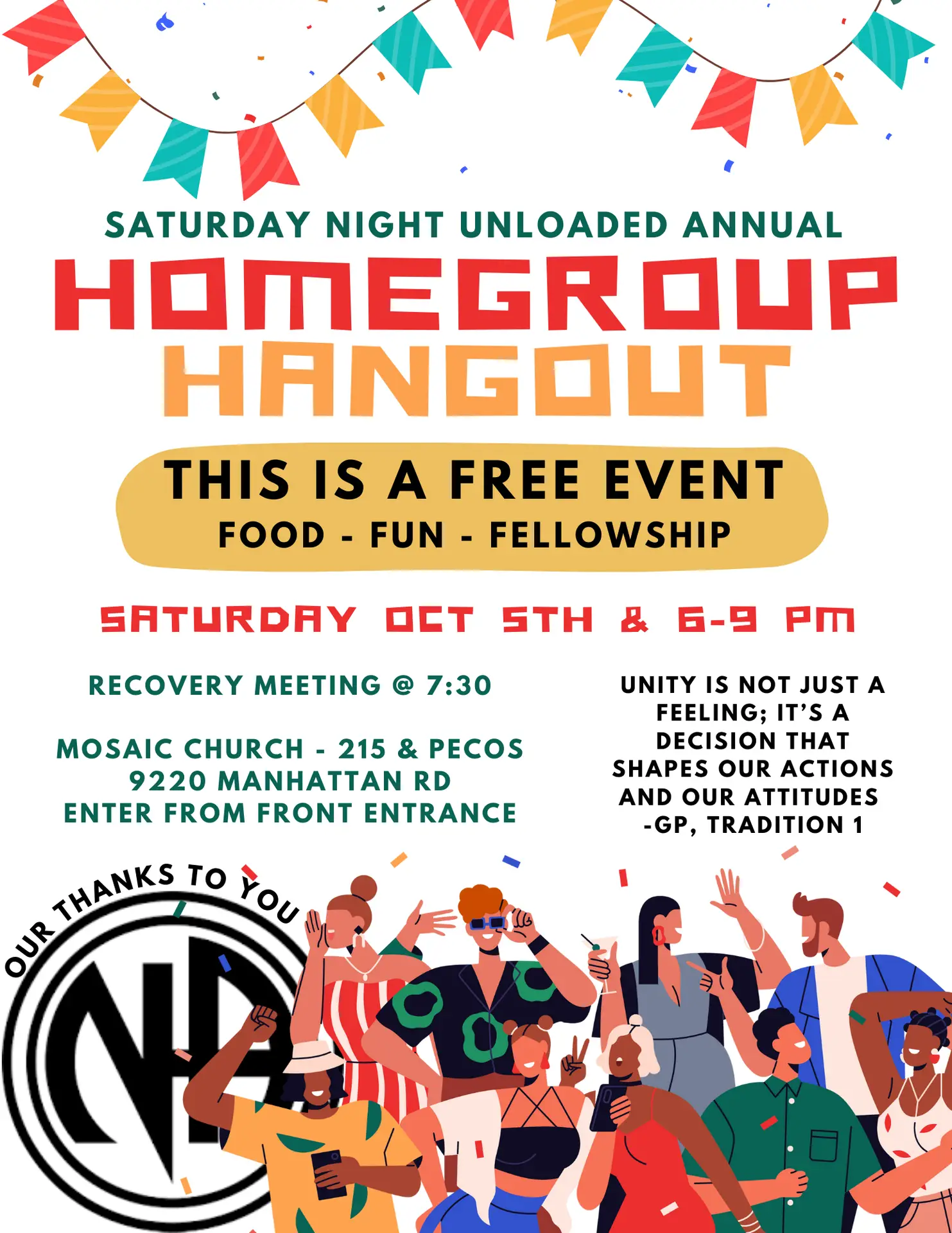 Saturday Night Unloaded, a Homegroup of Narcotics Anonymous is hosting their annual Homegroup Hangout. This is a free event. There will be food, fun and fellowship. The recovery meeting starts at 7:30pm
