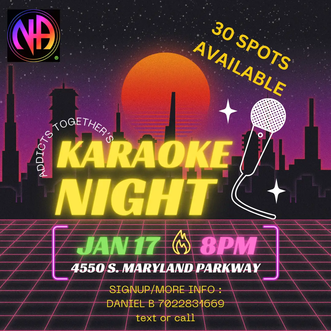 Fellowship Wednesday with Addicts Together group of N.A. We have room for up to 30 members. Cost is $5. Located at Gogo Karaoke Room 4550 S. Maryland Parkway, at Harmon and Maryland, across from UNLV. Please contact Daniel B to reserve a spot. 7022831669