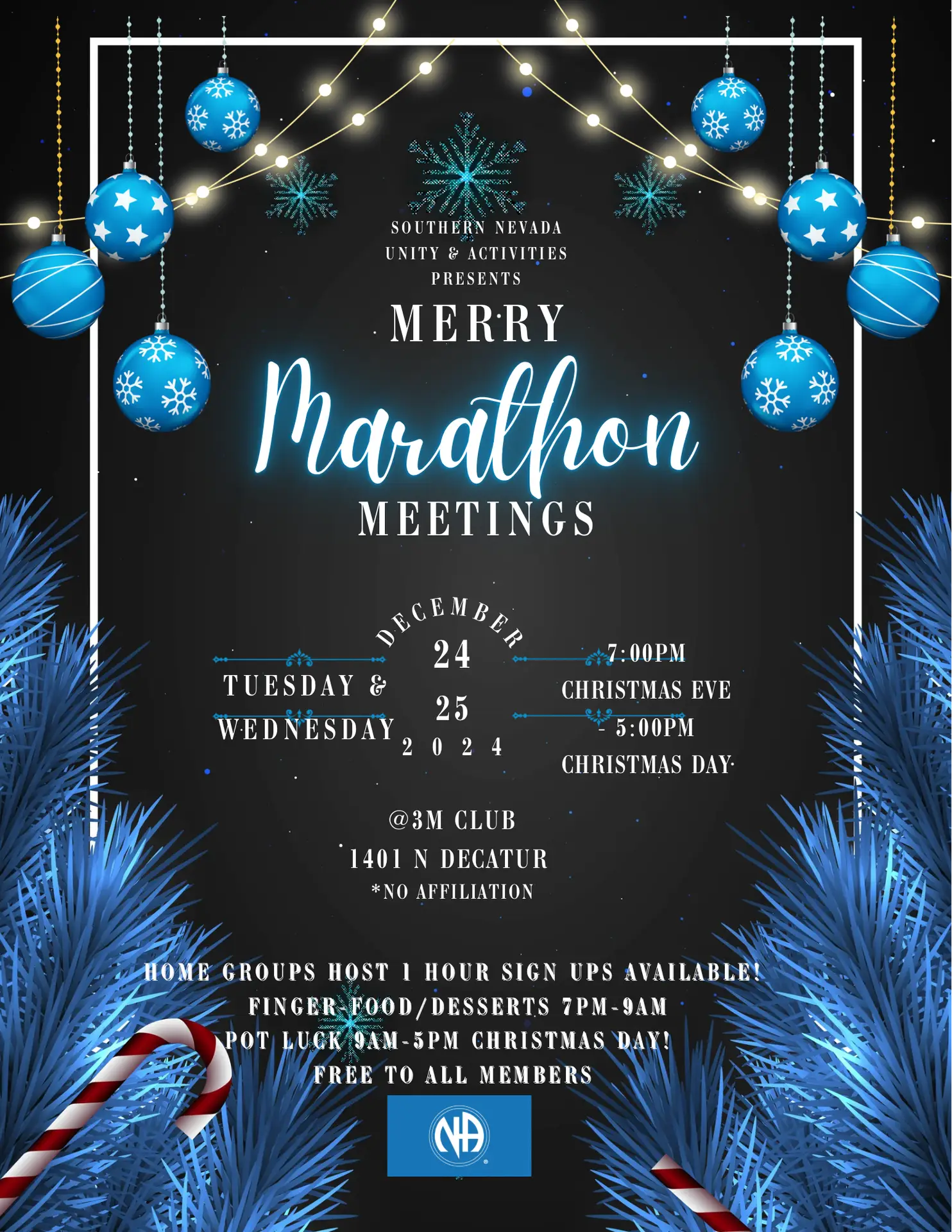Nearly 24 hours of meetings, food and fellowship. From 7pm on Christmas Eve through 5pm Christmas Day, come join Southern Nevada.