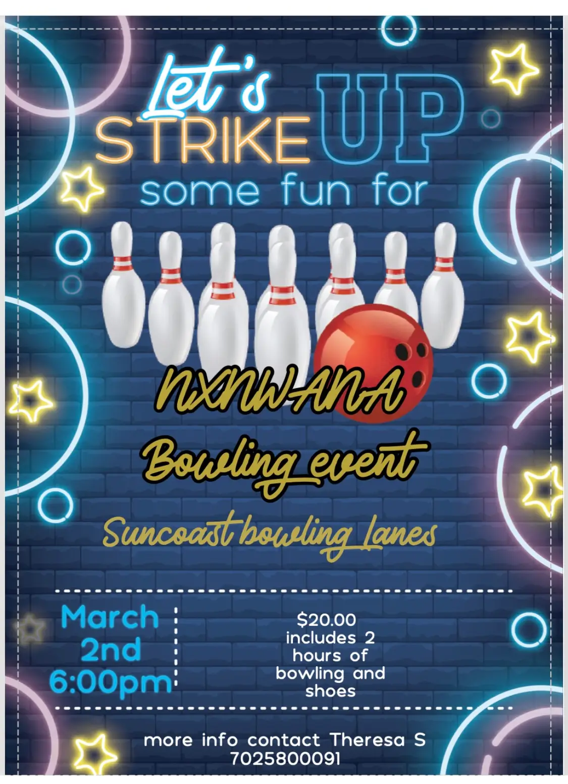 Suncoast bowling event For more info or to purchase Tickets Theresa S 702-680-0091