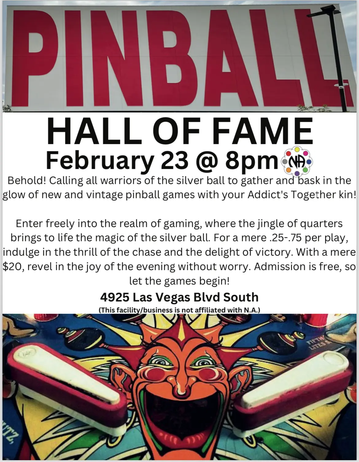 Come join Addicts Together for a night out at the Pinball Hall of Fame! 8pm- whenever the quarters and fun run out. Free entry – pay per play. .25 – .75 per game.