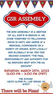GSRs will meet to bring the votes on the Conference Agenda Report (CAR) from their Home Group to the Region. These votes will be taken to the World Service Conference held 30 April – 6 May 2023.