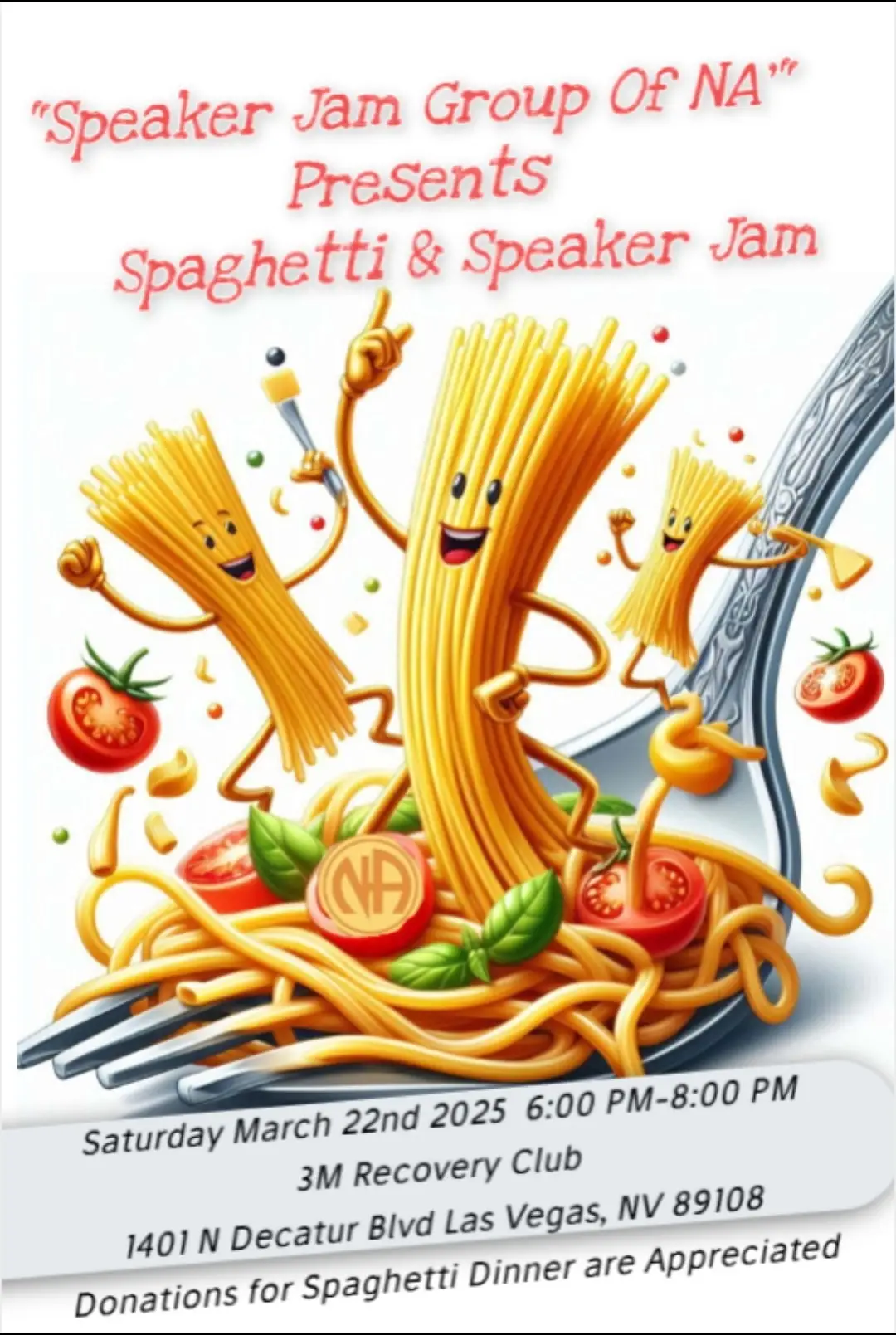 Speaker Jam with spaghetti dinner available and donations for the food appreciated.