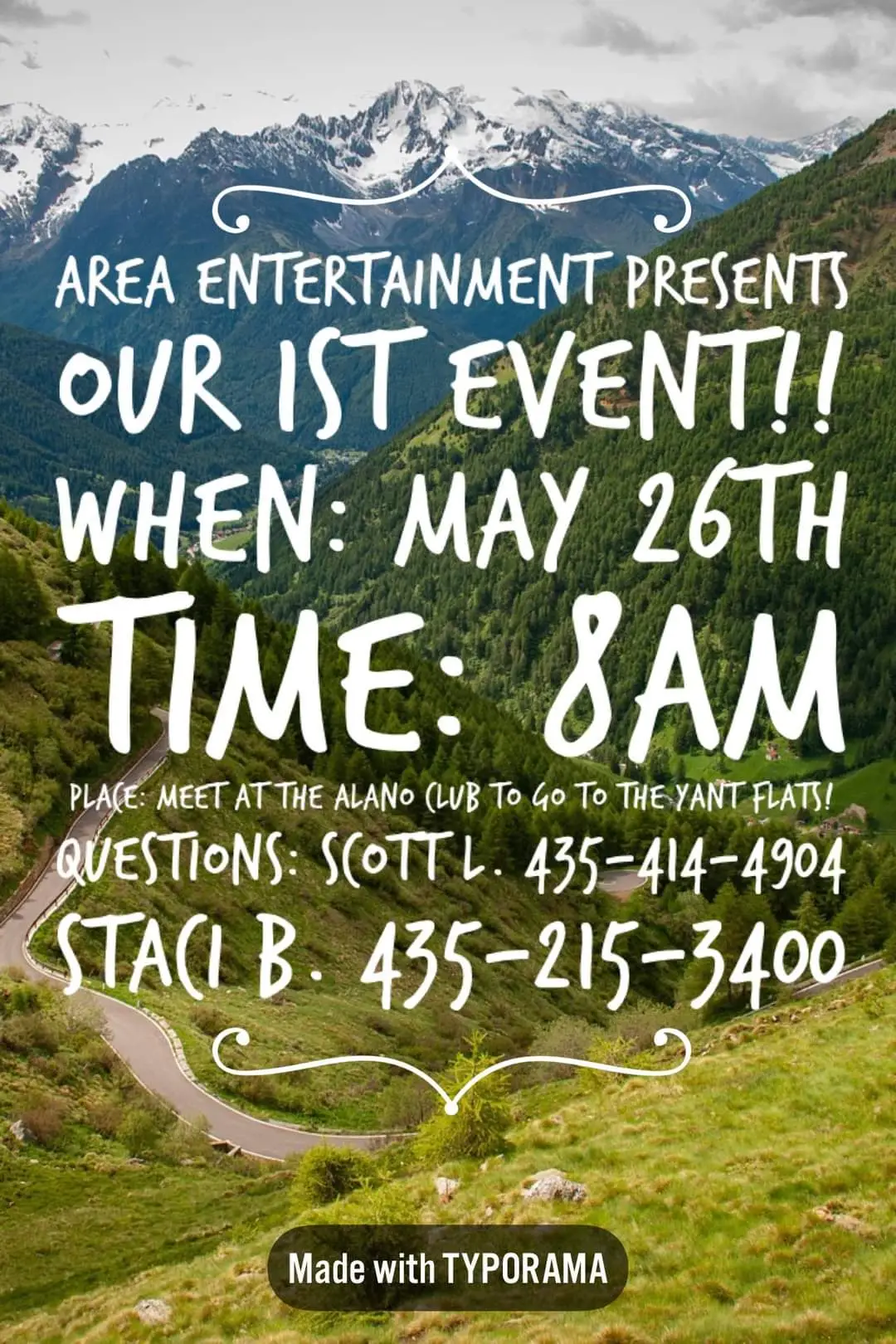 Area Entertainment Presents Our 1st Event!!! May 26th, 2024 8 AM Place: Meet at the Alano Club to go to the Yant Flats! Questions: Scott L. 435-414-4904 Staci B. 435-215-3400