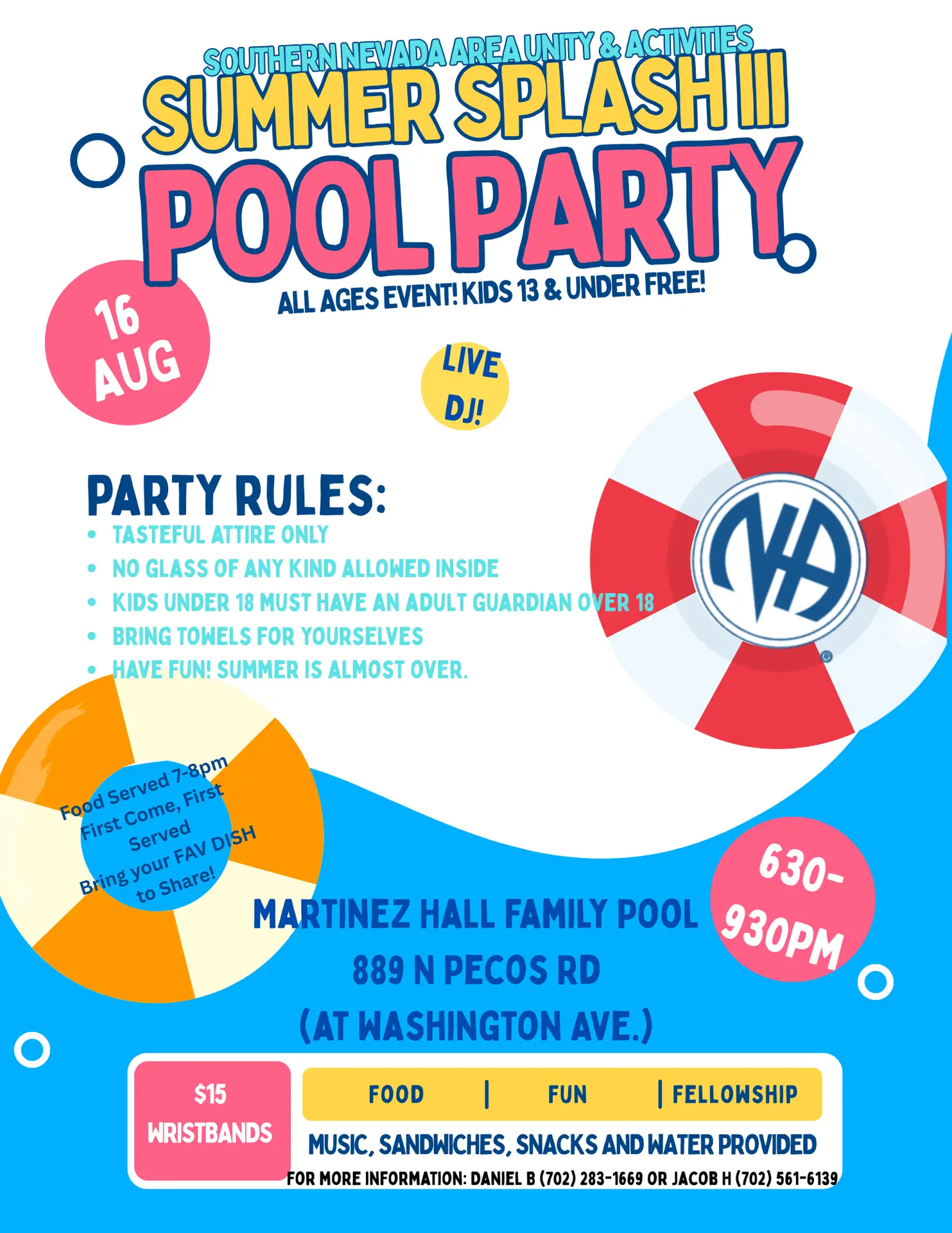 Southern Nevada Area of N.A. presents the third annual Summer Splash! Come out with the family for the last event before the kids go back to school. We rented the entire pool, Live, DJ, plenty of food and drinks for all! Food served 7-8pm. Wristbands available for entry $15 each. Children 13 and under are free! POOL RULES: No glassware allowed of any kind, respectful swim attire (for questionable items, ask a wristband sales person), clean up whatever you bring in.