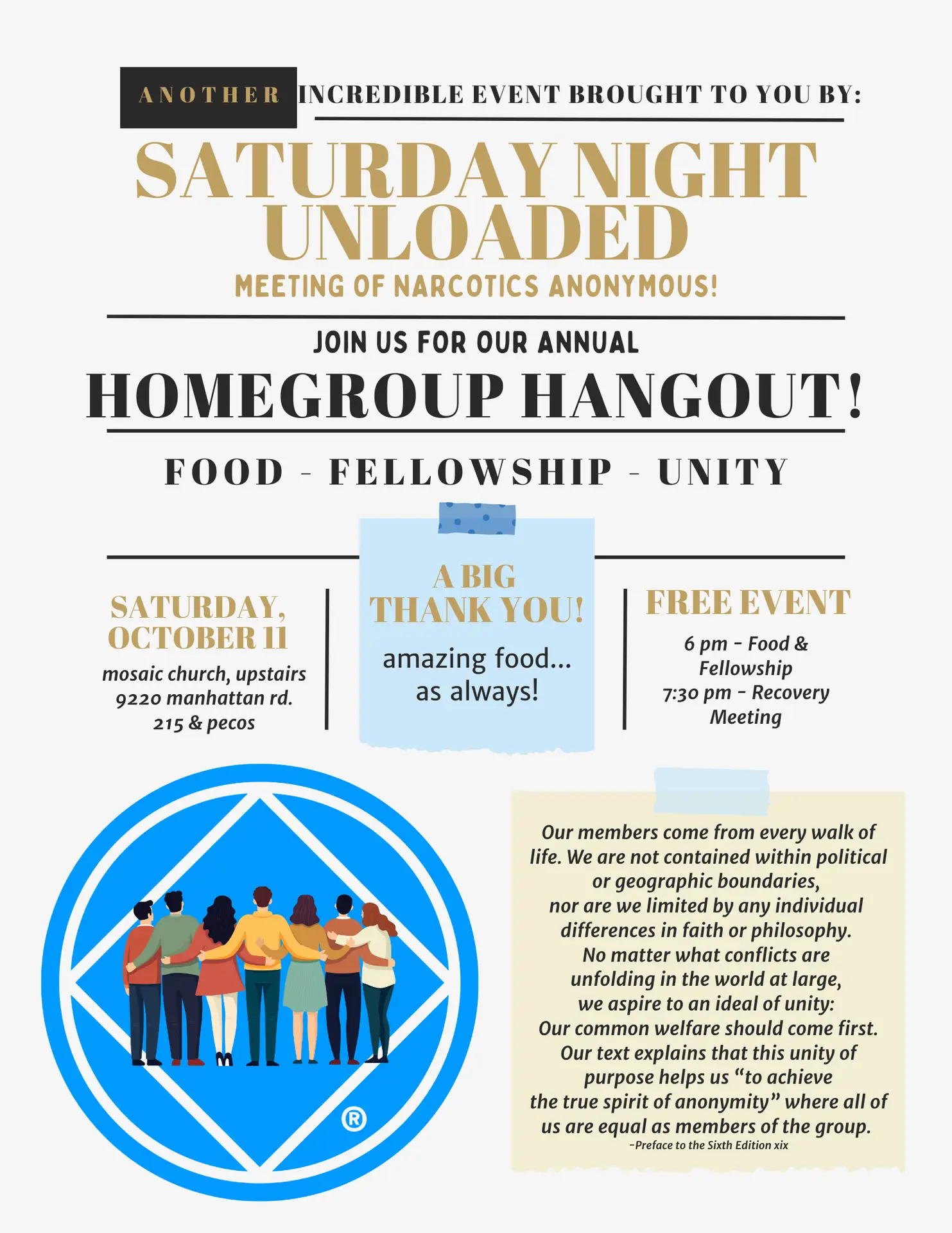 ![]() Our Homegroup's Annual Free Event! Please join us for a night of FOOD, FUN & FELLOWSHIP!