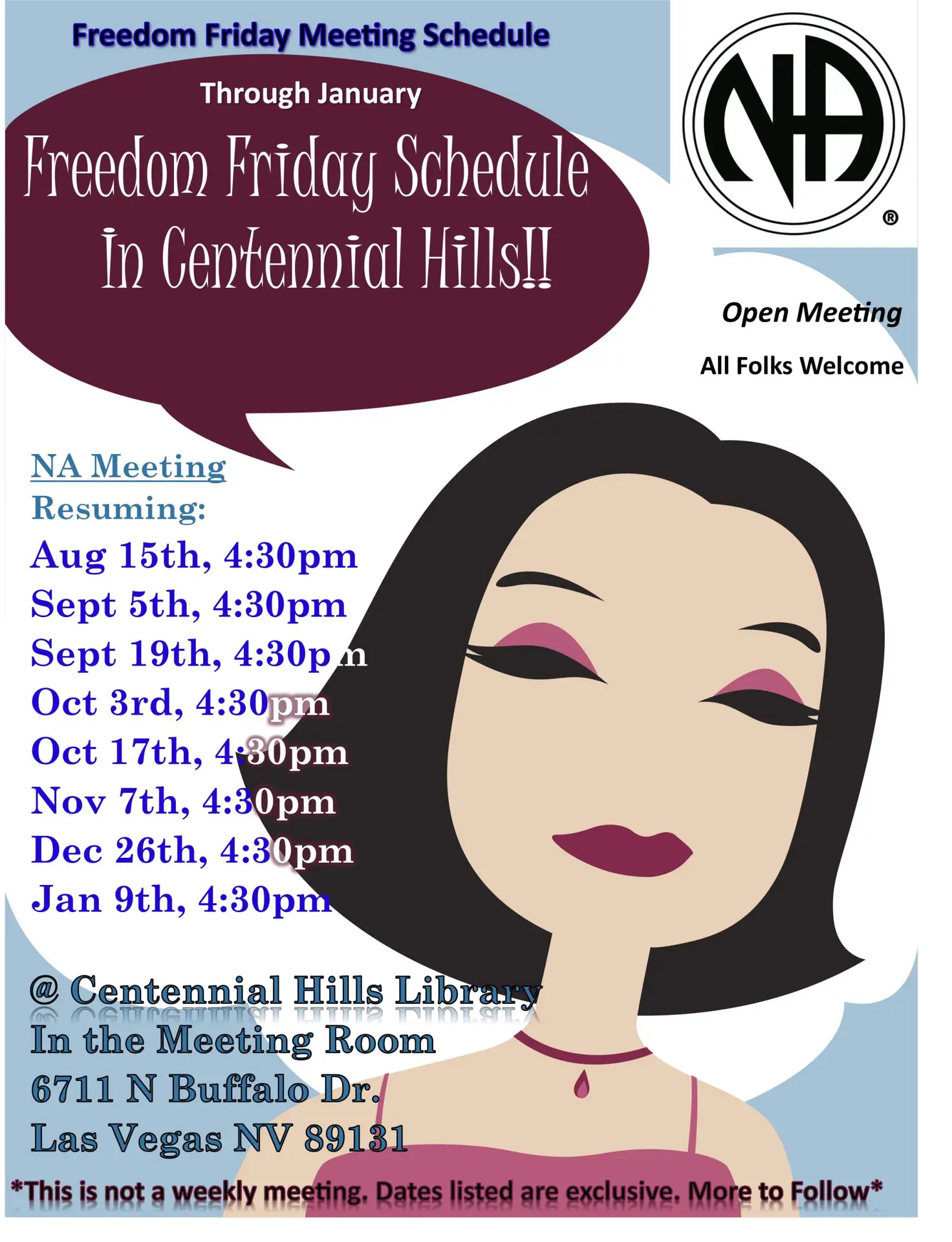 ![]() Centennial Hills NA Meeting Freedom Friday is back with 2 meetings per month Aug-Sept-Oct……dates are exclusive, please check calendar or call for updates!!