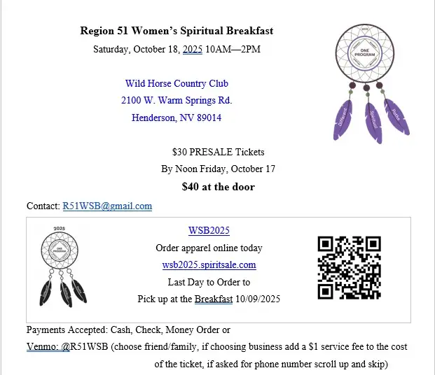 Committee meets at 11am. Admin Body meets at 10am. 1st Saturday of each month ONLY in person. 4800 Alpine Place (Willow Room) Las Vegas, NV 89107 |