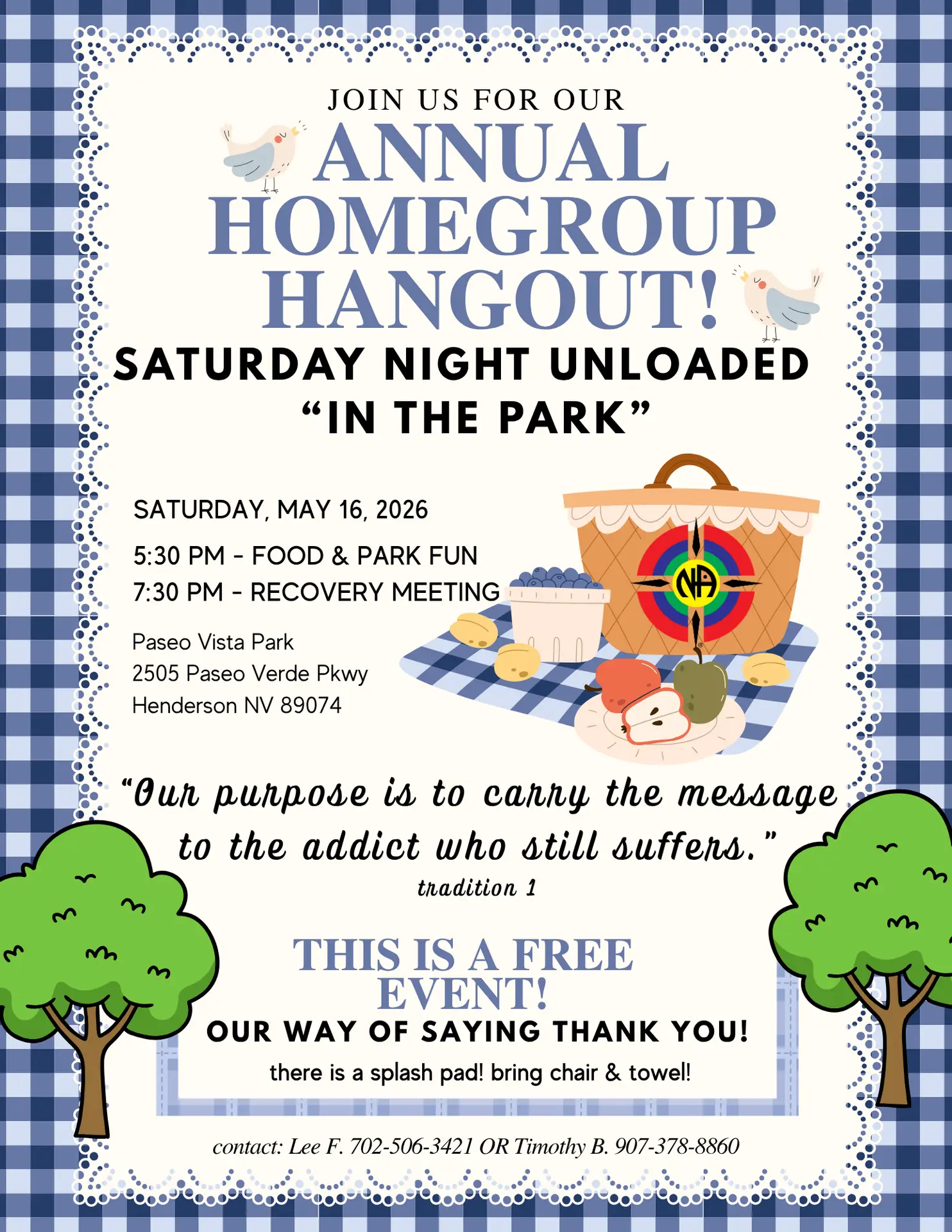 May 16 Homegroup Hangout! 5:30 pm - 9:00 pm Paseo Verde Park 2505 Paseo Verde Pkwy, Henderson Event Details Get Directions