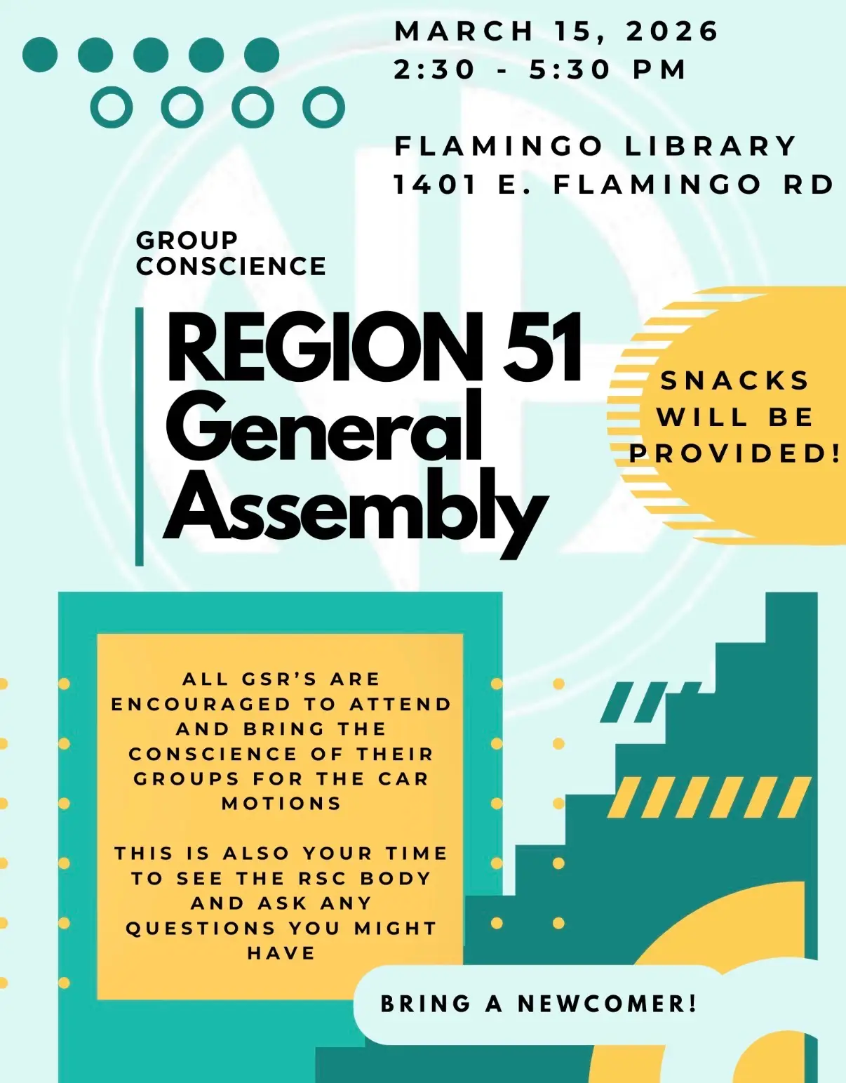 Mar 15 Regional Service Committee (RSC) meeting 2:30 pm - 5:30 pm Flamingo Library 1401 E Flamingo, Las Vegas Event Details Get Directions