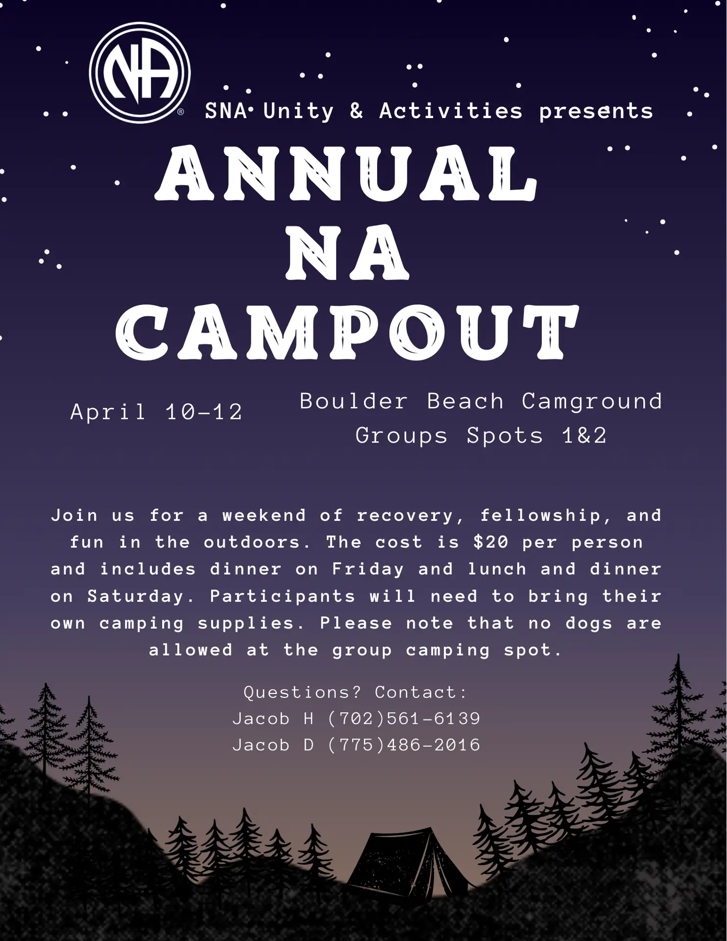 Apr 10 Annual NA Campout April 10 @ 12:00 pm - April 12 @ 10:00 am PDT Boulder Beach Campground Boulder City Event Details Get Directions