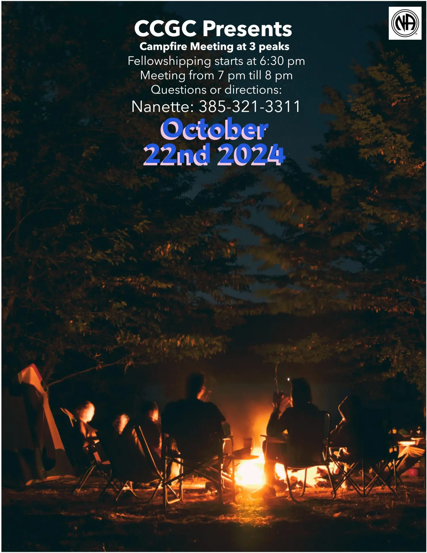 Campfire Meeting at 3 peaks Fellowshipping starts at 6:30 pm Meeting from 7 pm till 8 pm Questions or directions: Nanette: 385-321-3311 October 22nd 2024 3 Peaks West Mid-Valley Rd Cedar City, UT 84721