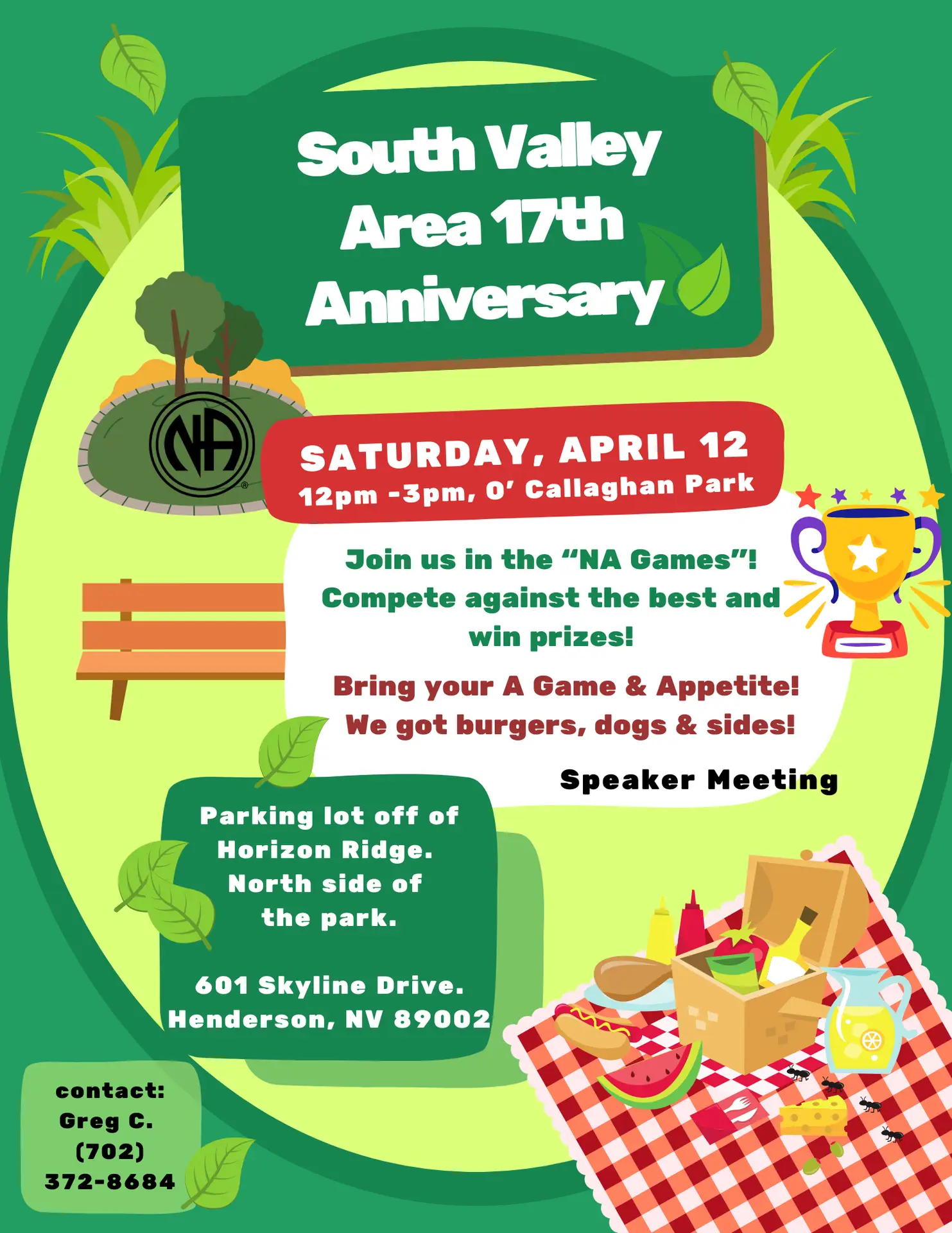 Join us to celebrate the area's 17th year with our spring picnic. The NA Games, come win prizes, participate, enjoy a burger, and fellowship with a speaker meeting.