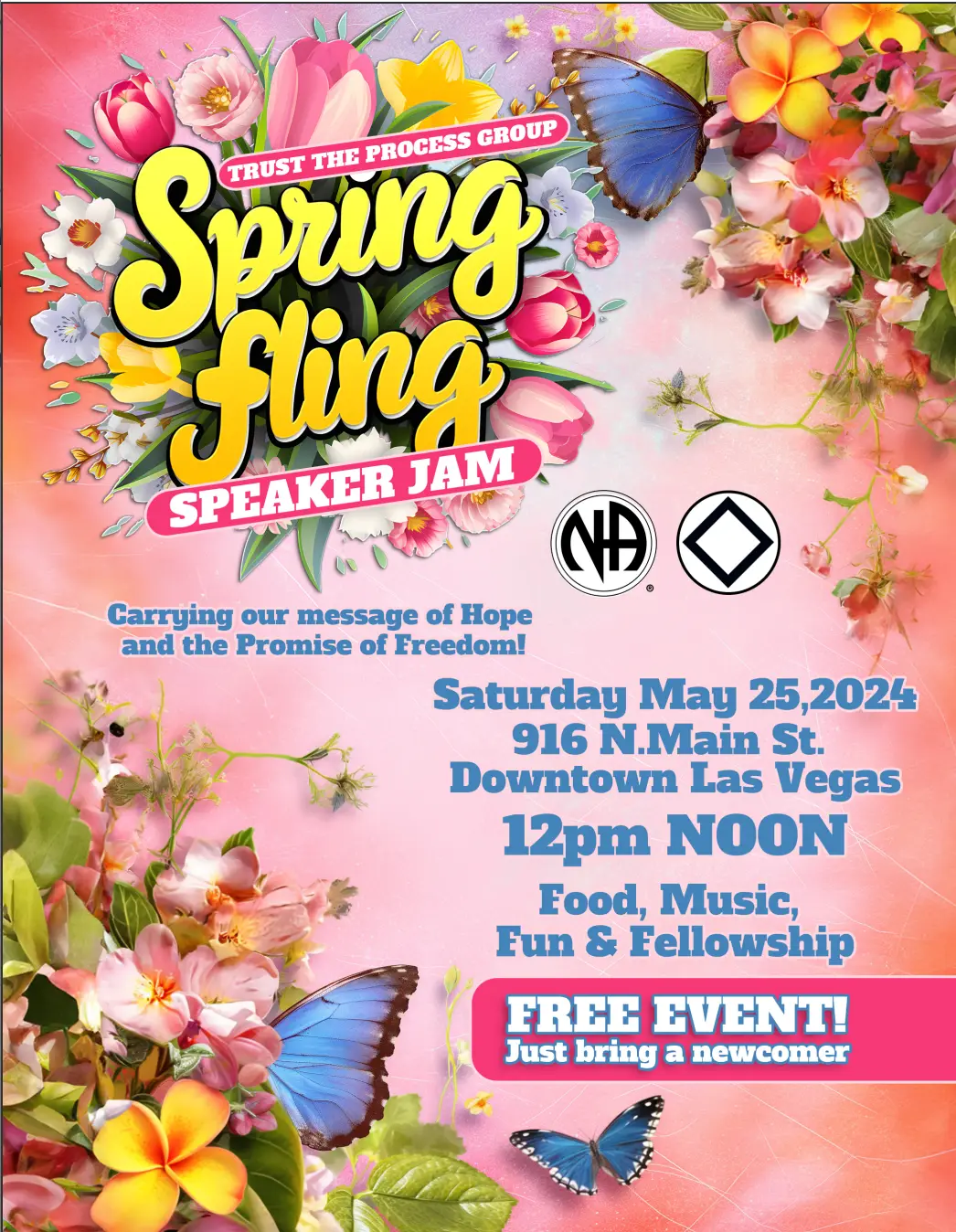 Trust the Process Group Spring Fling Speaker Jam Carrying our message of Hope and the Promise of Freedom! Saturday May 25, 2024 916 N. Main St. Downtown Las Vegas 12pm NOON Food, Music, Fun & Fellowship FREE EVENT! Just bring a newcomer For more info contact John L - 702-328-2797