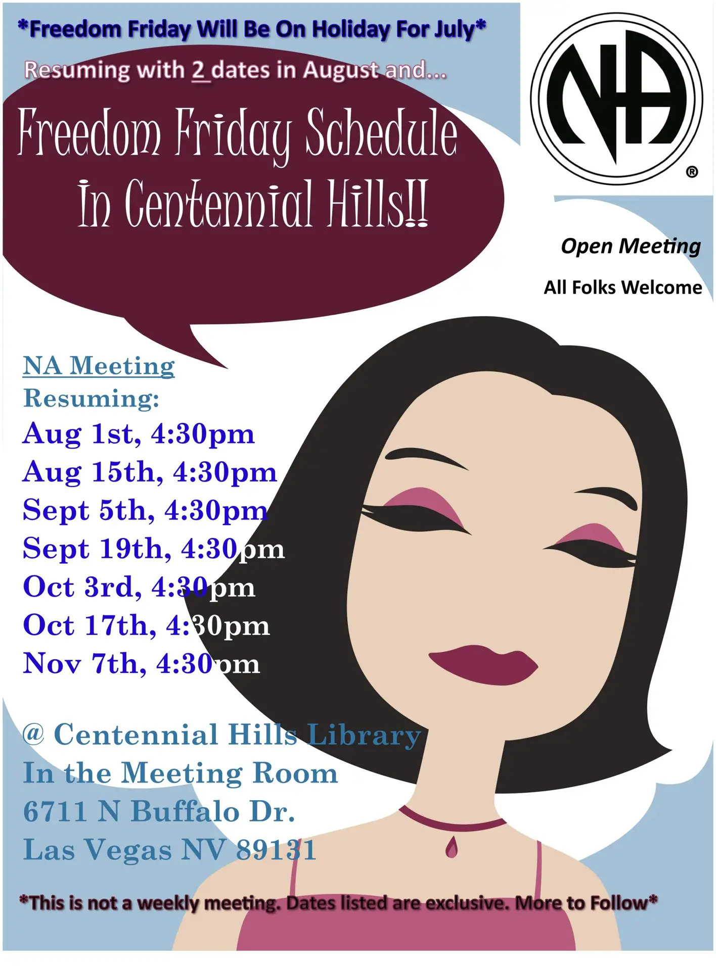 Centennial Hills Library 6711 N Buffalo Dr, Las Vegas, NV, United StatesCentennial Hills NA Meeting Freedom Friday is back with 2 meetings per month Aug-Sept-Oct……dates are exclusive, please check calendar or call for updates!!